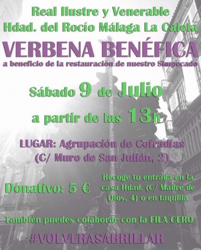 Este sábado 9 de Julio tenemos todos una cita en la sede de la Agrupación de Cofradías de Semana Santa de Málaga a partir de las 13 horas, en la Verbena Benéfica Pro-Restauración del Simpecado de la Real, Ilustre y Venerable Hermandad de Ntra. Sra. del Rocío de Málaga La Caleta.