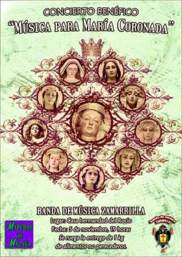 ¡Aún estás a tiempo para asistir al Concierto Benéfico que organiza la cuenta de Marchas de Málaga en la Casa Hermandad del RocÃo! Comenzará a las 19:00h bajo el tÃtulo "Música para MarÃa Coronada". Interpretará la Banda de Música de Zamarrilla.