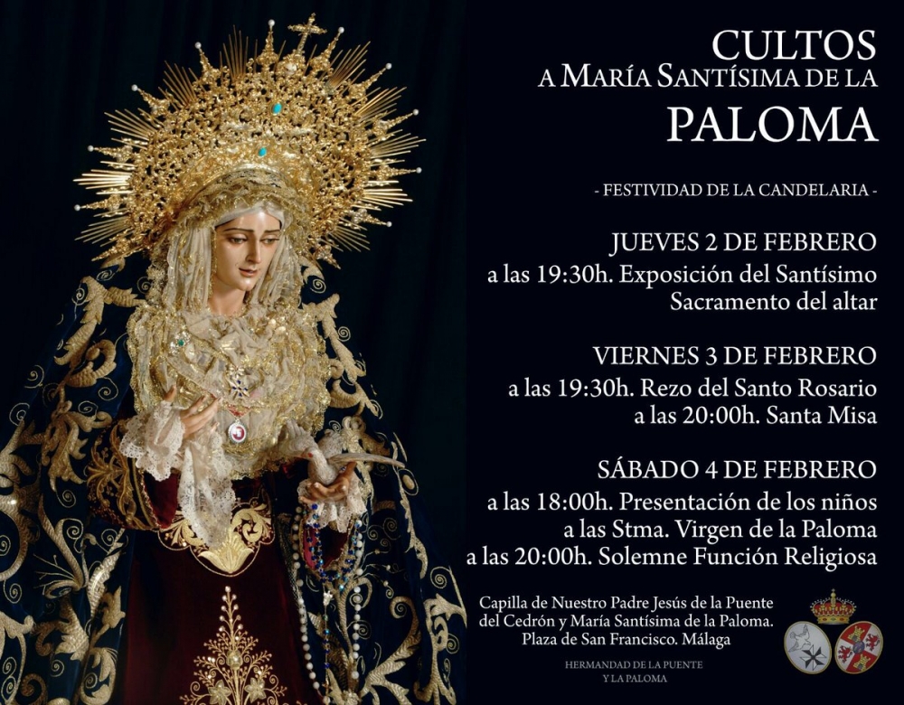 La Hermandad de la Puente y la Paloma publica en sus redes sociales el calendario previsto por la corporación para la realización de sus próximos cultos sumándose de esta manera a la festividad de la Candelaria.